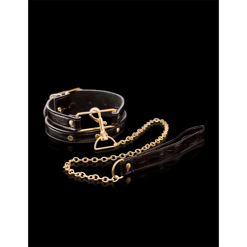 Explora las mejores fantasías de rol de mascotas con este lujoso collar con correa. El cuello de croc negro de alta resistencia cuenta con un suave forro de felpa que se siente muy bien contra la piel y una correa gruesa similar a un cinturón que se ajusta fácilmente para adaptarse a la mayoría de los tamaños. Engancha la correa de metal al espacio dorado cuadrado para asegurarte de que tu mascota favorita no escapará.